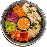 Spice up your mealtime with our vibrant Buffalo Bowl! Featuring tender sous vide protein (e.g., "chicken" or "plant-based protein") alongside a refreshing mix of crisp carrots, celery, ripe tomatoes, and zesty pickled red onions. This flavorful combination rests on a foundation of wholesome brown rice and is perfectly drenched in our legendary homemade buffalo sauce. Prepare your taste buds for a bold, fresh, and satisfying experience that delivers on flavor without compromise.