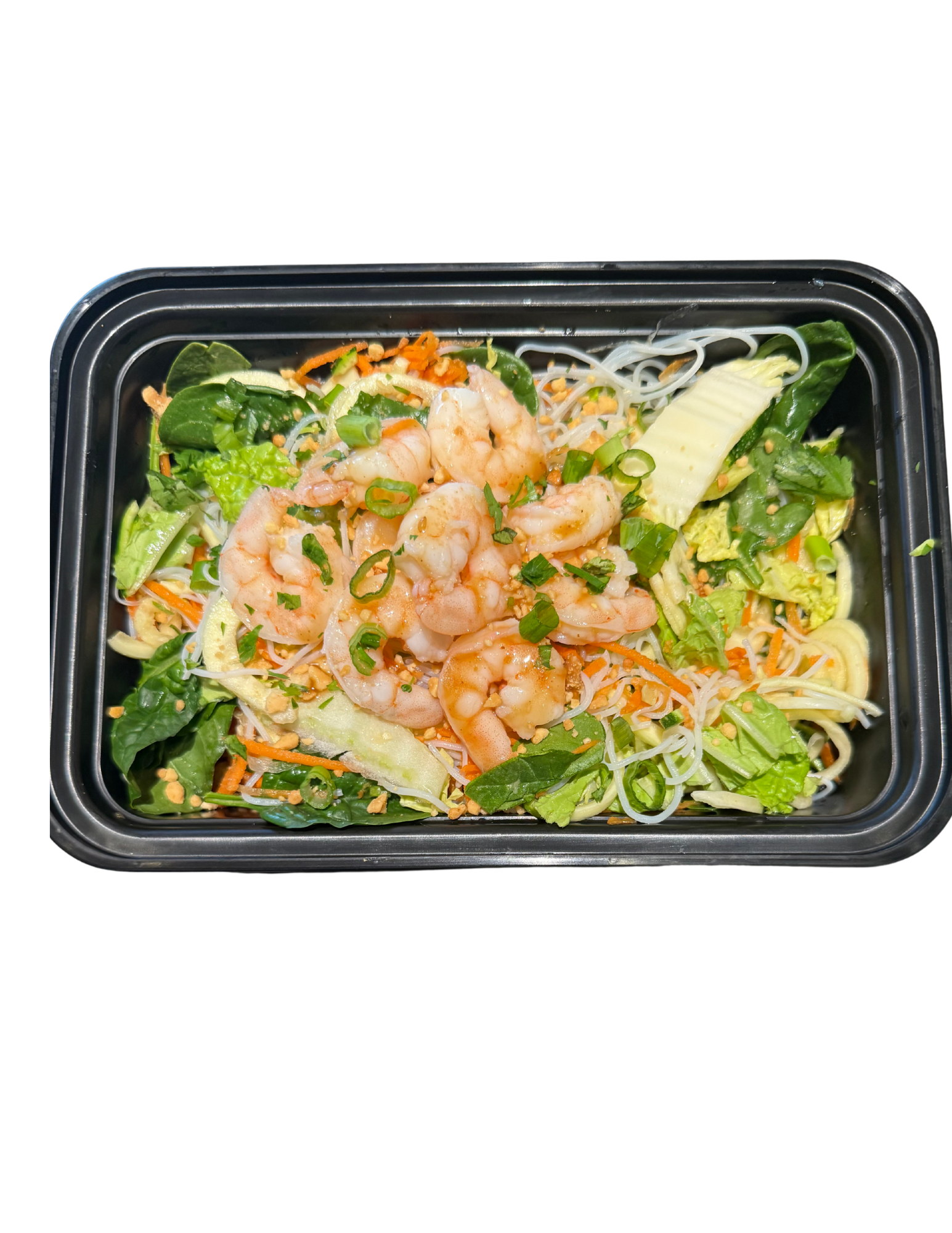 Experience the vibrant flavors of Thailand with our light and satisfying Pad Thai! We've crafted a wholesome version of this classic, featuring delicate glass noodles generously tossed with a colorful medley of crisp Napa cabbage, fresh spinach, shredded carrots, tender celery, and vibrant zucchini noodles (zoodles). The star of the show is your perfectly cooked protein (specify: e.g., "chicken," "shrimp," "tofu"), all coated in our rich, nutty, and irresistibly tangy house Thai peanut sauce. It’s a delightful balance of fresh vegetables and savory goodness in every forkful!