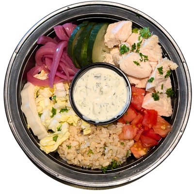 Our Gyro Bowl offers your choice of protein combined with fresh tomatoes, onions, cucumber, and Napa cabbage, all tossed with brown rice. Served with a side of our delicious house-made Tzatziki.